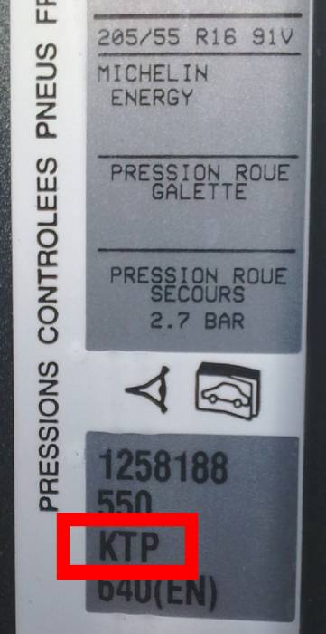 Voici un exemple de plaque constructeur situé une véhicule Peugeot. Dans le cas ci-dessous, le code peinture officiel du véhicule est KTP.
